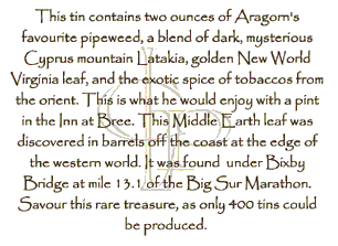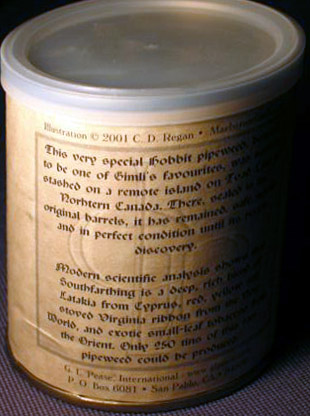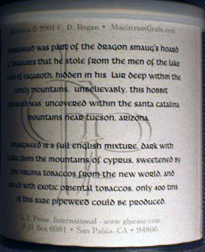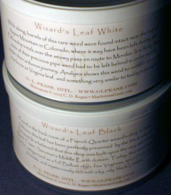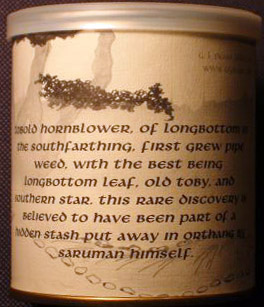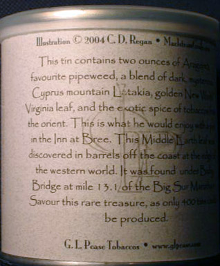 Por su parte, el extraordinario mezclador G.L. Pease, a lo largo de los años, también a dedicado gran cantidad de labores a la mítica saga del «Señor de los anillos» y «El Hobbit». Labores como Southern Star Tobacco en el año 2000 con una producción limitada de 225 latas, Southfarthing en 2001 limitado a 250 latas, Smaugweed en 2003 del cual se producieron 400 latas, Aaragon en 2004 tambien limitado a 400 latas, Wizzard Leaf White y Wizzard Leaf Black en 2005 con una producción 325 unidades o Shelob’s Lair Tobacco y Isengard Tobacco en 2006 con 325 latas producidas respectivamente.